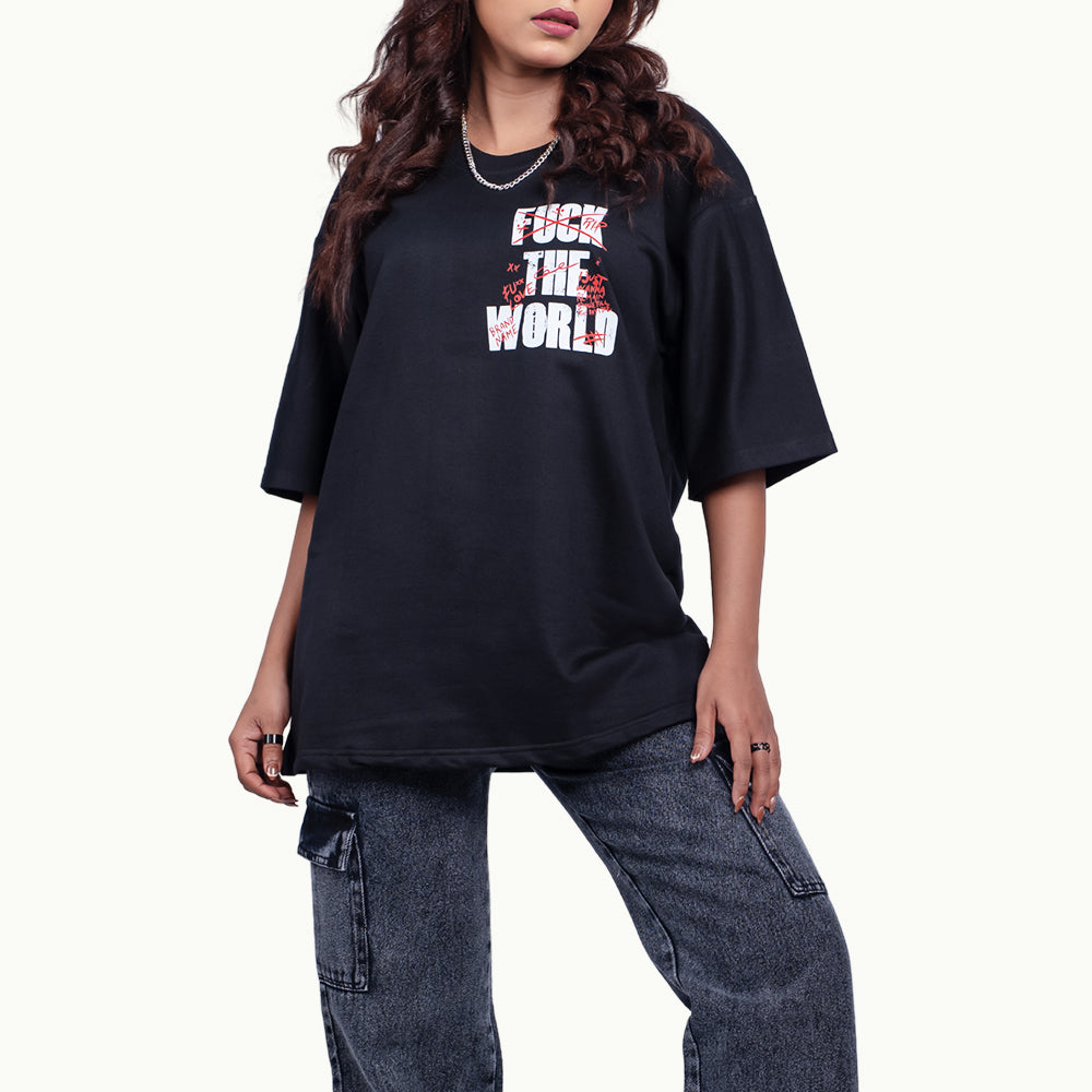 We are presenting our bold "Fuck the World" print t-shirt, where your bold attitude meets fashion. This powerful statement help you to express your true attitude Whether you're making a statement for the society or just want to add a fearless attitude that t-shirt is there to empower and inspire. Embrace your individuality and show the world that you won't be silenced. Place your order now before our collection will go out of stock.