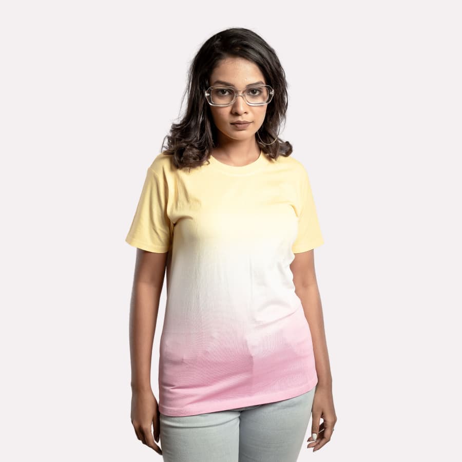 Our tee is a mesmerizing fusion of yellow, white, and pink, blending seamlessly like a vibrant sunset. Symbolizing unity and the beauty of diversity, wear this shirt as a reminder to embrace life's colourful moments and celebrate the harmony of our shared experiences.
