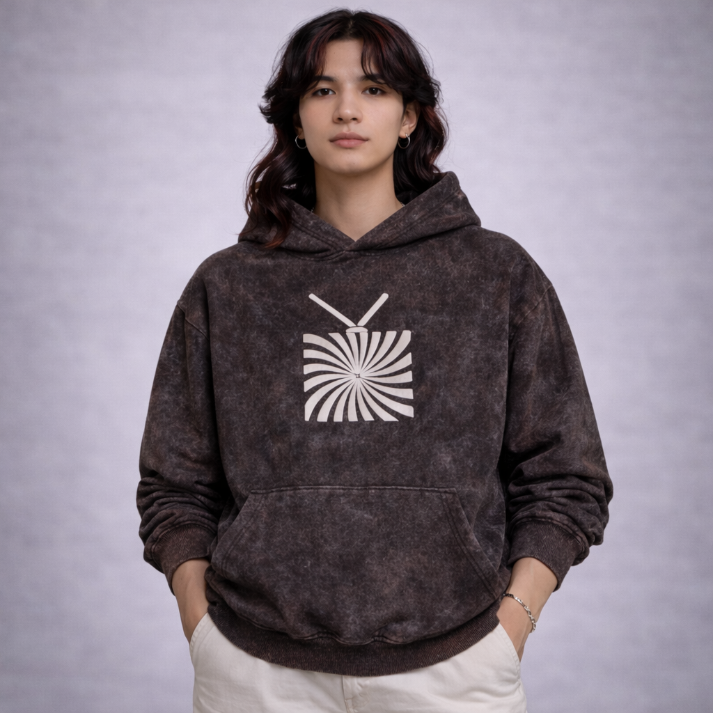 Screen printed Brain Wash hoodie a bold piece that blends street style with social commentary. Crafted from premium heavy weight cotton fleece and finished with a unique acid wash. This hoodie delivers both comfort and attitude. The front features a minimal hypnotic TV graphic, while the back calls out “News Media Brain Washing Since 1930s” in striking stencil typography. A perfect mix of rebellion and reflection for those who think freely and dress boldly.