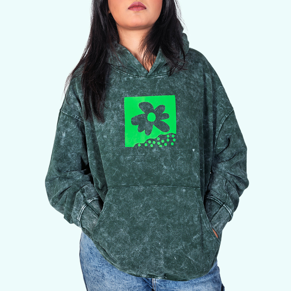 Our Retro Bloom Oversized Hoodie by DRIPPZ Original blends vintage charm with streetwear Vibes. Featuring bold and classy puff printed green floral graphics on acid wash base, it offers a relaxed fit, soft cotton fleece fabric and all day comfort with effortless style.