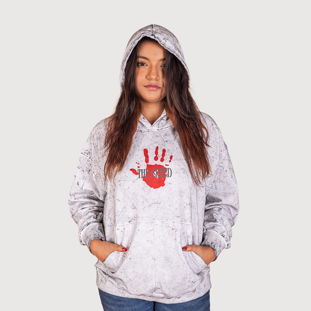 The Greed Oversized Hoodie blends acid wash texture with bold front and back graphics, creating a powerful streetwear statement. Designed for unisex comfort, this hoodie delivers a relaxed fit, raw attitude and youth driven energy in every detail.