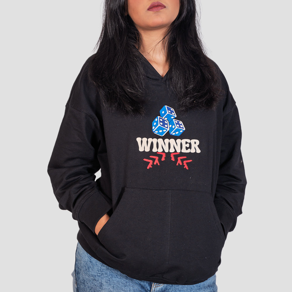 Step into the game with confidence in the Winner Oversized Black Hoodie for unisex. Designed for those who rise despite ultimate all chaos, this unisex hoodie blends comfort with attitude. Featuring bold dice graphics on the front and back, it represents luck, risk, and fearless style. Made from premium cotton fleece, it delivers ultimate warmth and street-ready comfort perfect for any season, any vibe.